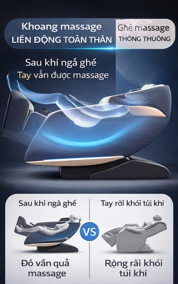 Hệ thống con lăn silicone mềm chuyển động linh hoạt trong không gian đa chiều, chạy dọc theo khung sườn SL dài 135cm để thực hiện thao tác massage từ cổ vai gáy cho tới phần mông. Với 6 kỹ thuật massage điêu luyện gồm: Nhào, Đấm, Vỗ, Xoa bóp, Bấm huyệt … tác động lên các vùng bị đau mỏi toàn thân để giải phóng cơn đau, trả lại cảm giác thư thái dễ chịu