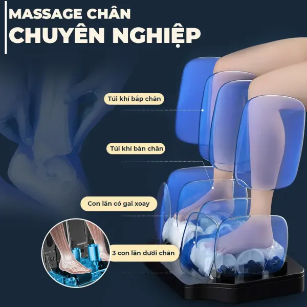 Trang bị hệ thống 3 – 4 dãy bi lăn cuộn hoạt động đồng thời, thực hiện các thao tác nhào bắp chân, cào lòng bàn chân, kết hợp túi khí ôm sát và chế độ kéo giãn linh hoạt, mang đến trải nghiệm massage chuyên sâu, chân thực như bàn tay chuyên gia.